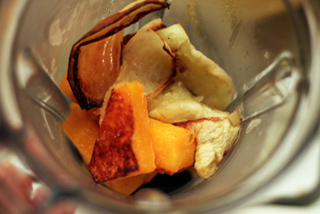 So to make my individual portion of soup, I scooped some squash, some onion, and some apple into the Vitamix blender: