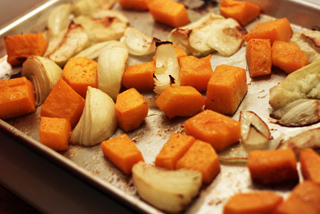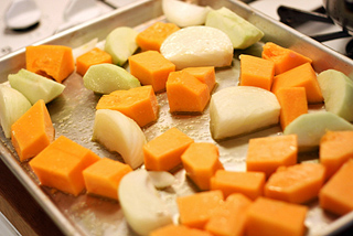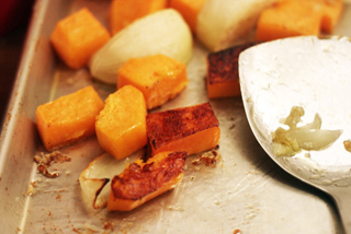 With the holidays rapidly approaching, this is a great recipe to have up your sleeve. Here’s how simple (and brilliant) this is: I preheated the oven to 425 degrees. Then, on a cookie sheet, I placed big chunks of the butternut squash, the onion cut into wedges, the Granny Smith apple peeled and quartered, and I tossed everything with olive oil, salt, and pepper.