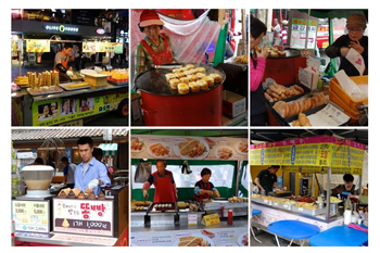 The ones that stand out in my memory are the spiral potato fries on skewers, the miniature loaves of bread baked in a tiny charcoal oven, then skillet fried with an egg on top and the pan fried dumplings and wraps.